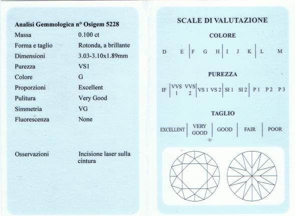 I diamanti con caratura inferiore ai 10 punti non consentono l’incisione a laser sulla corona, date le dimensioni, quindi non sono marchiati  a laser ma vengono comunque consegnati in un elegante confezione e con la certificazione di purezza colore e caratura.