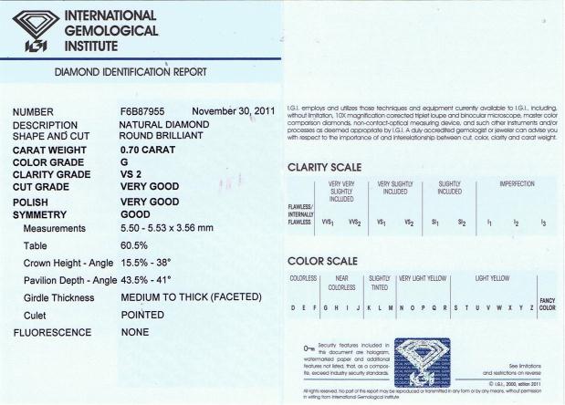 Certificato diamante : VS2 070 G Prezzo : 3100 |